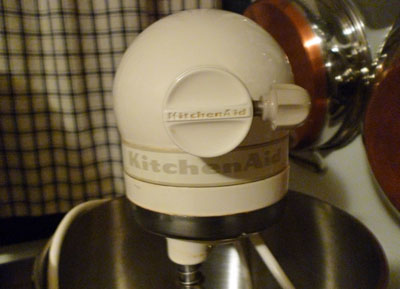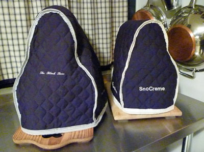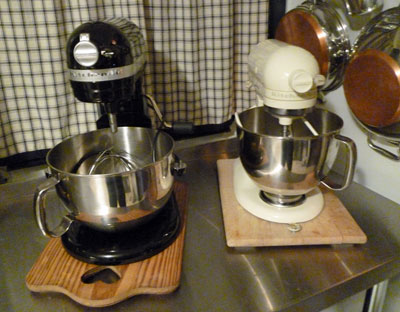 I has two KitchenAid stand mixers. One is a 325W in Cream color. I names it SnoCreme. The other is a big 600W Professional in Licorice that I has named The Black Rose. I luvs dees roun n' rouns. In my wanderings, I finds ol' cutting boards. I attaches a few teflon bumpers on the bottom to make it easy to slide on de countertops. At times, I sticks a cabinet pull on de fronts fer pulling and sich. I places ALL my smallish power tools on de boards. I puts on rubberish grommets to hold the big mixers on whilst dey is rockin' n' rollin' on hi!! Don' want dem ta R-U-N-D-O-F-T (spells rundoft) lak my 1st wife. I also has a nice lady who will make custom saddle blankets fer my appliances. She adds pockets fer de manuals and embroideries my Custom Names on them, to include color piping. Keep de dustys off. |